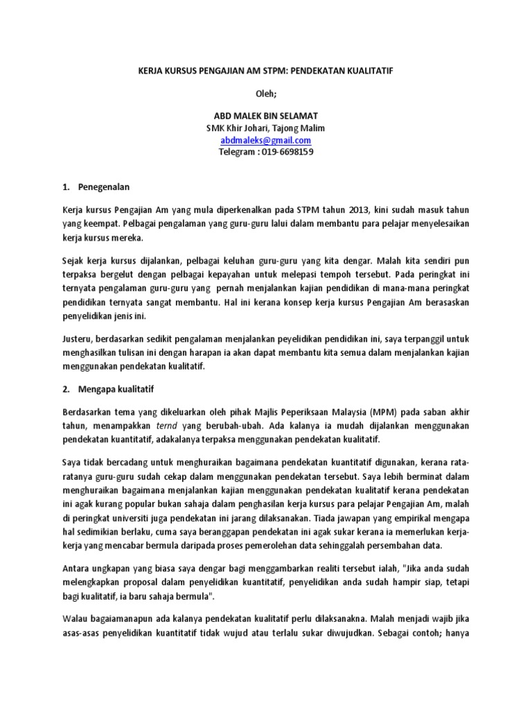 Kerja Kursus Pengajian Am Stpm Pendekatan Kualitatif2 Pdf